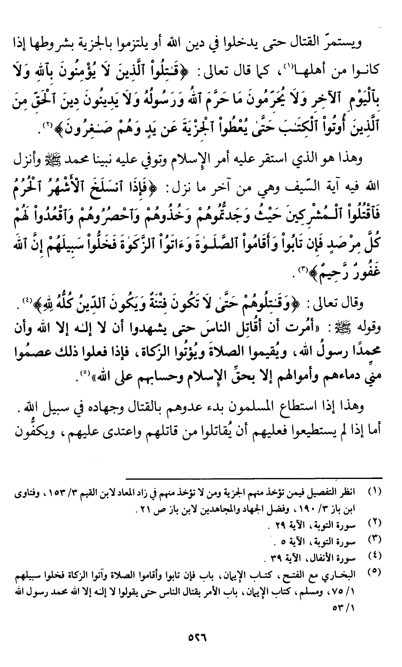 (¬1) انظر التفصيل فيمن تؤخذ منهم الجزية ومن لا تؤخذ منهم في زاد المعاد لابن القيم 3/ 153، وفتاوى ابن باز 3/ 190، وفضل الجهاد والمجاهدين لابن باز ص 21.