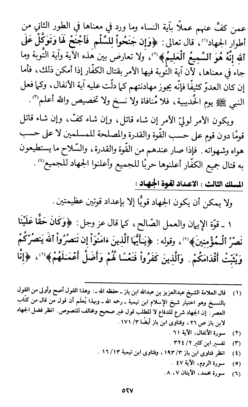 (¬1) قال العلامة الشيخ عبد العزيز بن عبد الله ابن باز- حفظه الله-: وهذا القول أصح وأولى من القول بالنسخ وهو اختيار شيخ الإسلام ابن تيمية- رحمه الله- وبهذا يعلم أن قول من قال من كتاب العصر إن الجهاد شرع للدفاع لا للطلب قول غير صحيح ومخالف للنصوص. انظر فضل الجهاد لابن باز ص 26، وفتاوى ابن باز أيضا 3/ 171.