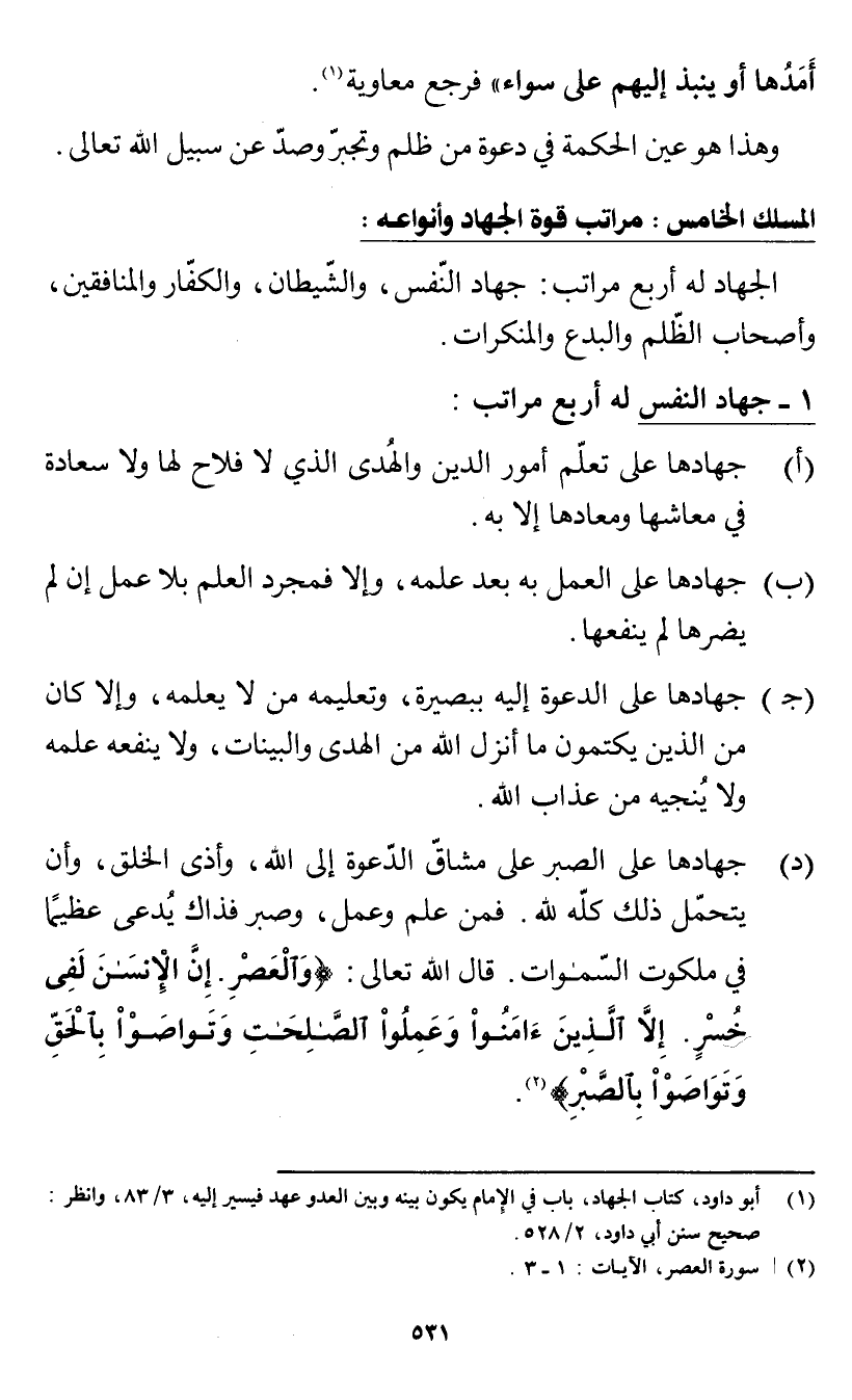 1 - جهاد النفس له أربع مراتب: (أ) جهادها على تعلم أمور الدين والهدى الذي لا فلاح لها ولا سعادة في معاشها ومعادها إلا به.
