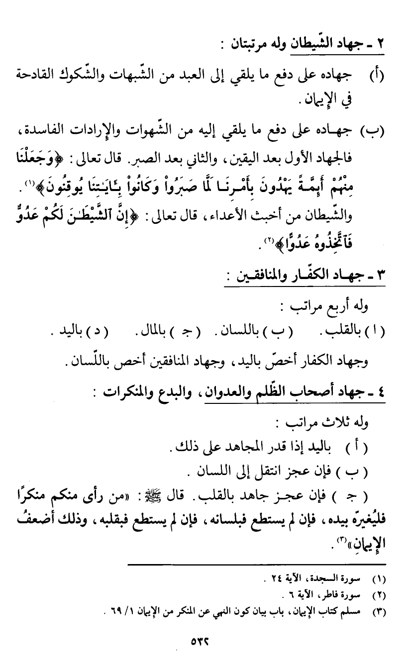 (ب) جهاده على دفع ما يلقي إليه من الشهوات والإرادات الفاسدة، فالجهاد الأول بعد اليقين، والثاني بعد الصبر. قال تعالى: {وَجَعَلْنَا مِنْهُمْ أَئِمَّةً يَهْدُونَ بِأَمْرِنَا لَمَّا صَبَرُوا وَكَانُوا بِآيَاتِنَا يُوقِنُونَ} [السجدة: 24] (¬1). والشيطان من أخبث الأعداء، قال تعالى: {إِنَّ الشَّيْطَانَ لَكُمْ عَدُوٌّ فَاتَّخِذُوهُ عَدُوًّا} [فاطر: 6] (¬2).