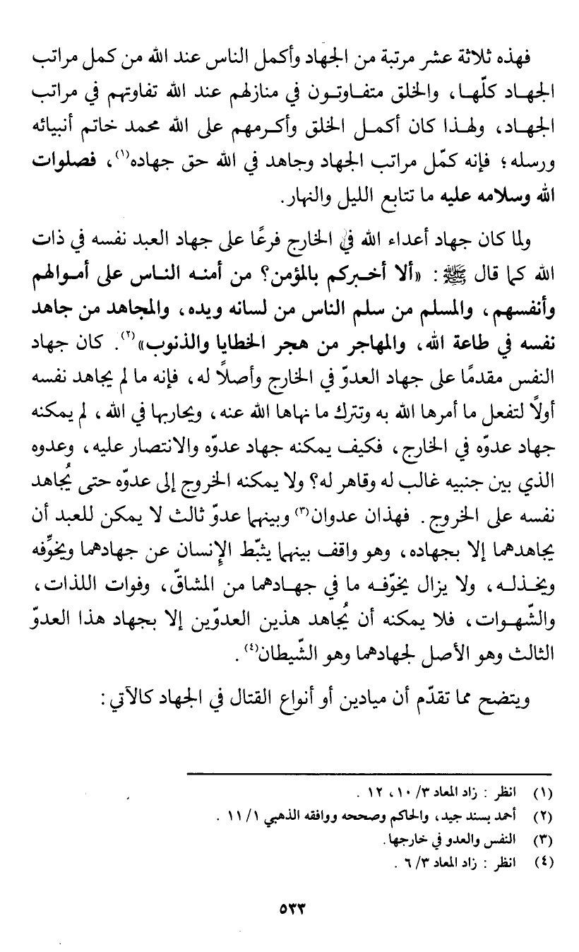 فهذه ثلاثة عشر مرتبة من الجهاد وأكمل الناس عند الله من كمل مراتب الجهاد كلها، والخلق متفاوتون في منازلهم عند الله تفاوتهم في مراتب الجهاد، ولهذا كان أكمل الخلق وأكرمهم على الله محمد خاتم أنبيائه ورسله؛ فإنه كفل مراتب الجهاد وجاهد في الله حق جهاده (¬1) فصلوات الله وسلامه عليه ما تتابع الليل والنهار.