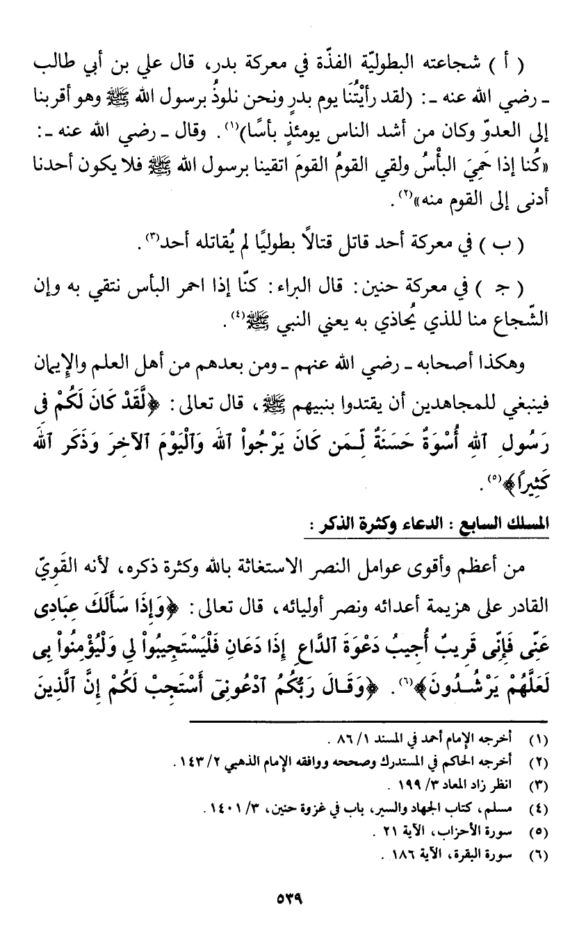 (ج) في معركة حنين: قال البراء: «كنا إذا احمر البأس نتقي به وإن الشجاع منا للذي يحاذي به يعني النبي صلى الله عليه وسلم» (¬4).