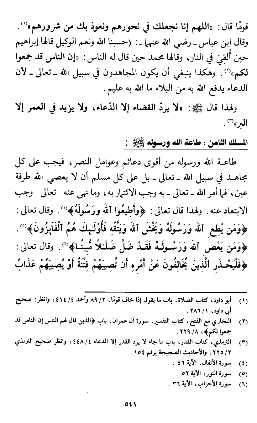 قوما قال: «اللهم إنا نجعلك في نحورهم ونعوذ بك من شرورهم» (¬1). وقال ابن عباس - رضي الله عنهما-: «حسبنا الله ونعم الوكيل قالها إبراهيم حين ألقي في النار، وقالها محمد حين قال له الناس: "إن الناس قد جمعوا لكم» (¬2). وهكذا ينبغي أن يكون المجاهدون في سبيل الله- تعالى- لأن الدعاء يدفع الله به من البلاء ما الله به عليم.