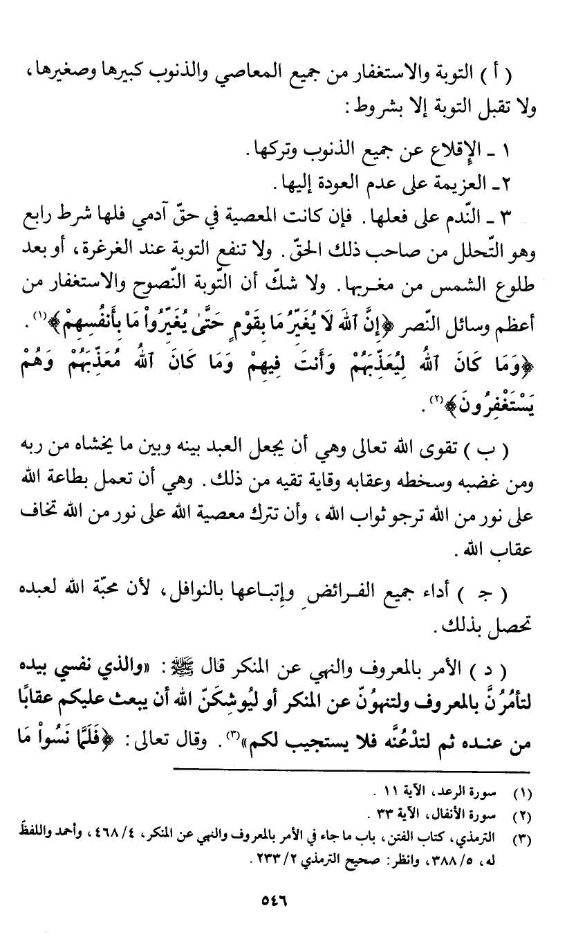 (أ) التوبة والاستغفار من جميع المعاصي والذنوب كبيرها وصغيرها، ولا تقبل التوبة إلا بشروط: