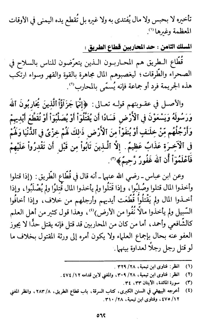 (¬4) أخرجه البيهقي في السنن الكبرى، كتاب السرقة، باب قطاع الطريق، 8/ 283، وانظر المغني 12/ 475، وفتاوى ابن تيمية، 28/ 310.