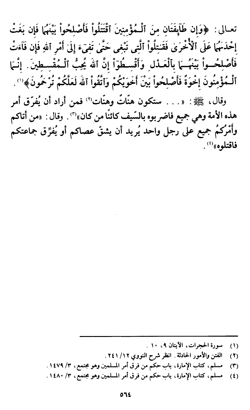 تعالى: {وَإِنْ طَائِفَتَانِ مِنَ الْمُؤْمِنِينَ اقْتَتَلُوا فَأَصْلِحُوا بَيْنَهُمَا فَإِنْ بَغَتْ إِحْدَاهُمَا عَلَى الْأُخْرَى فَقَاتِلُوا الَّتِي تَبْغِي حَتَّى تَفِيءَ إِلَى أَمْرِ اللَّهِ فَإِنْ فَاءَتْ فَأَصْلِحُوا بَيْنَهُمَا بِالْعَدْلِ وَأَقْسِطُوا إِنَّ اللَّهَ يُحِبُّ الْمُقْسِطِينَ - إِنَّمَا الْمُؤْمِنُونَ إِخْوَةٌ فَأَصْلِحُوا بَيْنَ أَخَوَيْكُمْ وَاتَّقُوا اللَّهَ لَعَلَّكُمْ تُرْحَمُونَ} [الحجرات: 9 - 10] (¬1).