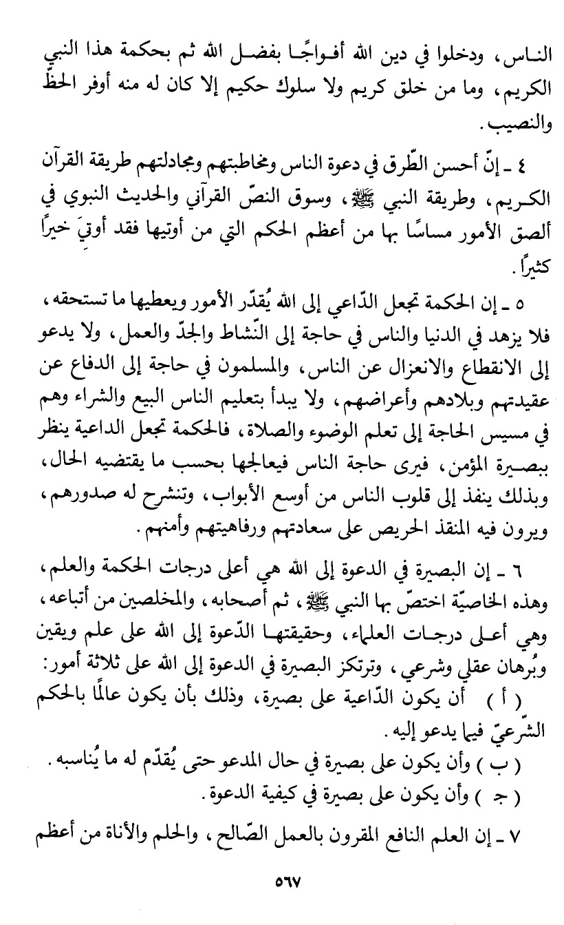 5 - إن الحكمة تجعل الداعي إلى الله يقدر الأمور ويعطيها ما تستحقه، فلا يزهد في الدنيا والناس في حاجة إلى النشاط والجد والعمل، ولا يدعو إلى الانقطاع والانعزال عن الناس، والمسلمون في حاجة إلى الدفاع عن عقيدتهم وبلادهم وأعراضهم، ولا يبدأ بتعليم الناس البيع والشراء وهم في مسيس الحاجة إلى تعلم الوضوء والصلاة، فالحكمة تجعل الداعية ينظر ببصيرة المؤمن، فيرى حاجة الناس فيعالجها بحسب ما يقتضيه الحال، وبذلك ينفذ إلى قلوب الناس من أوسع الأبواب، وتنشرح له صدورهم، ويرون فيه المنقذ الحريص على سعادتهم ورفاهيتهم وأمنهم.