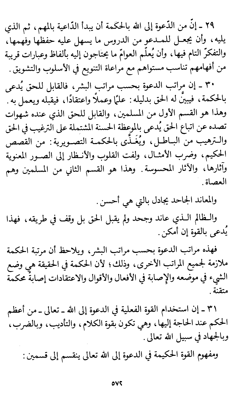 30 - إن مراتب الدعوة بحسب مراتب البشر، فالقابل للحق يدعى بالحكمة، فيبين له الحق بدليله: علما وعملا واعتقادا، فيقبله ويعمل به. وهذا هو القسم الأول من المسلمين، والقابل للحق الذي عنده شهوات تصده عن اتباع الحق يدعى بالموعظة الحسنة المشتملة على الترغيب في الحق والترهيب من الباطل، ويغذى بالحكمة التصويرية: من القصص الحكيم، وضرب الأمثال، ولفت القلوب والأنظار إلى الصور المعنوية وآثارها، والآثار المحسوسة. وهذا هو القسم الثاني من المسلمين وهم العصاة.