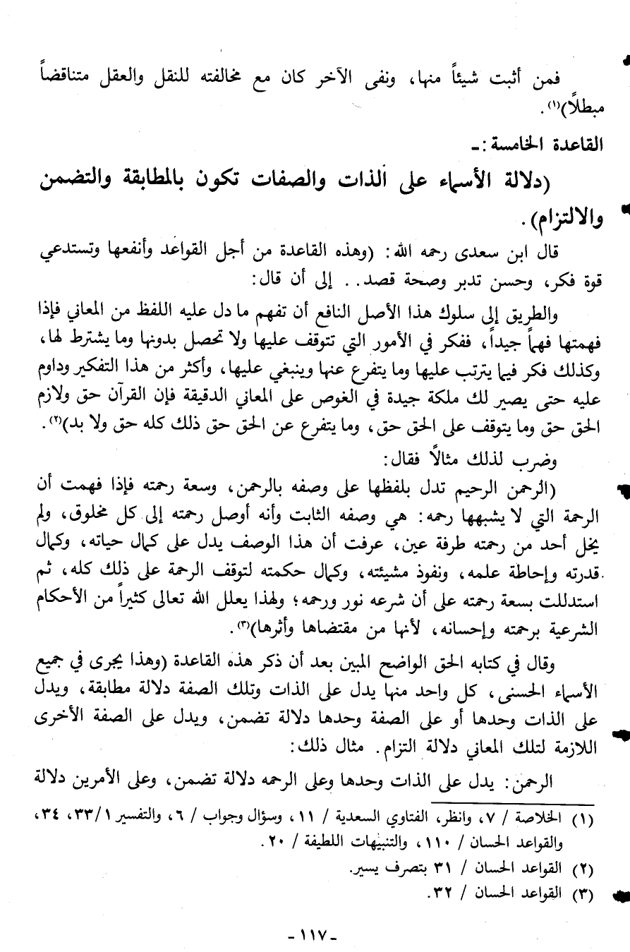 وقال في كتابه الحق الواضح المبين بعد أن ذكر هذه القاعدة "وهذا يجري في جميع الأسماء الحسنى، كل واحد منها يدل على الذات وتلك الصفة دلالة مطابقة، ويدل على الذات وحدها أو على الصفة وحدها دلالة تضمن، ويدل على الصفة الأخرى اللازمة لتلك المعاني دلالة التزام. مثال ذلك: