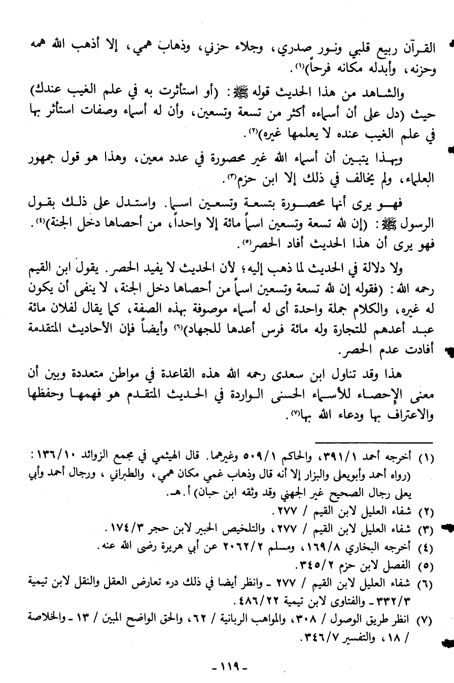 هذا وقد تناول ابن سعدي رحمه الله هذه القاعدة في مواطن متعددة وبين أن معنى الإحصاء للأسماء الحسنى الواردة في الحديث المتقدم هو فهمها وحفظها والاعتراف بها ودعاء الله بها7.