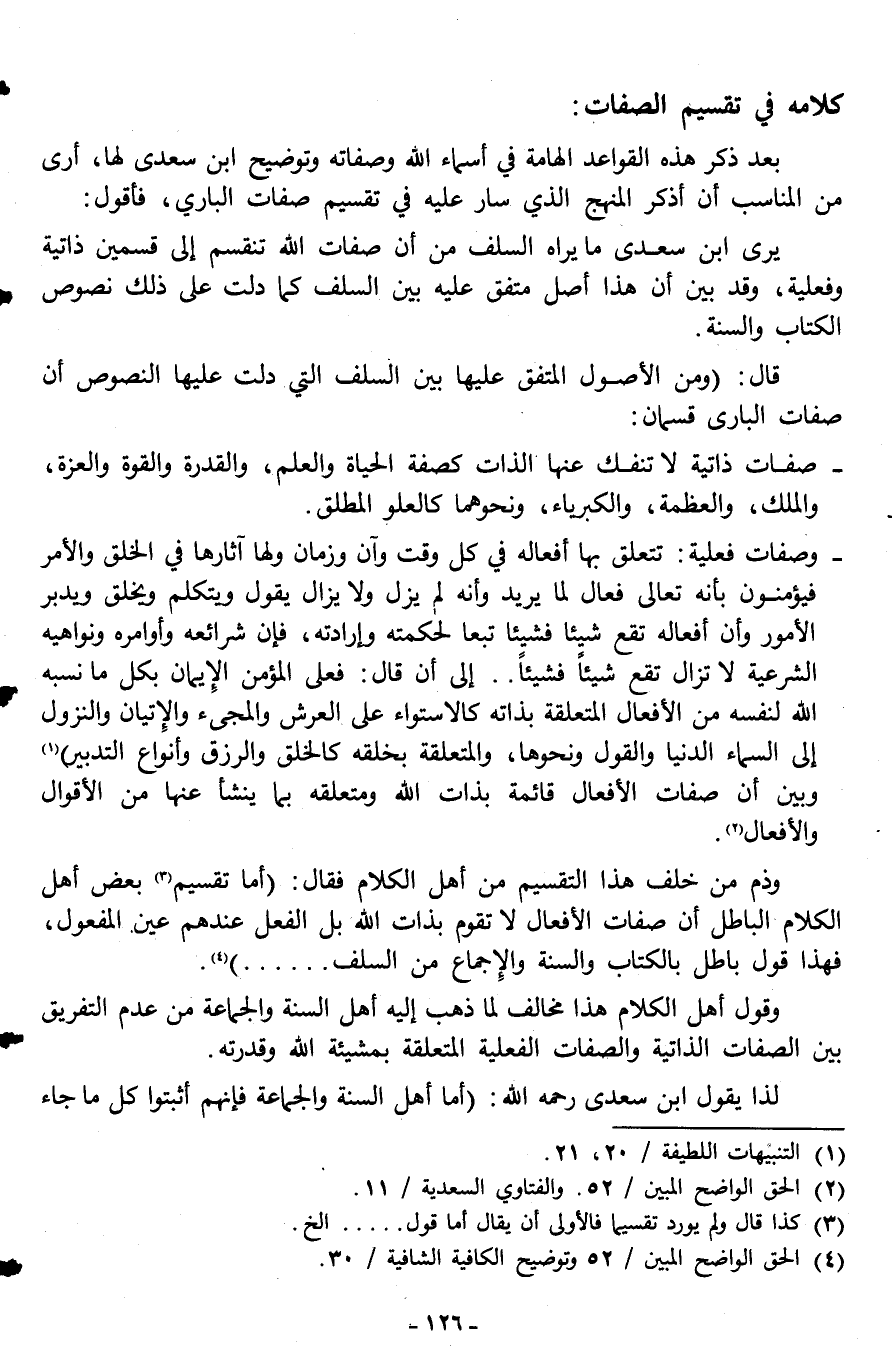 ـ وصفات ذاتية لا فعلية: تتعلق بها أفعاله في كل وقت وآن وزمان ولها آثارها في الخلق والأمر فيؤمنون بأنه تعالى فعال لما يريد وأنه لم يزل ولا يزال يقول ويتكلم ويخلق ويدبر الأمور وأن أفعاله تقع شيئا فشيئا تبعا لحكمته وإرادته، فإن شرائعه وأوامره ونواهيه الشرعية لا تزال تقع شيئا فشيئاً.. إلى أن قال: فعلى المؤمن الإيمان بكل ما نسبه الله لنفسه من الأفعال المتعلقة بذاته كالاستواء على العرش والمجيء والإتيان والنزول إلى السماء الدنيا والقول ونحوها، والمتعلقة بخلقه كالخلق والرزق وأنواع التدبير"1.