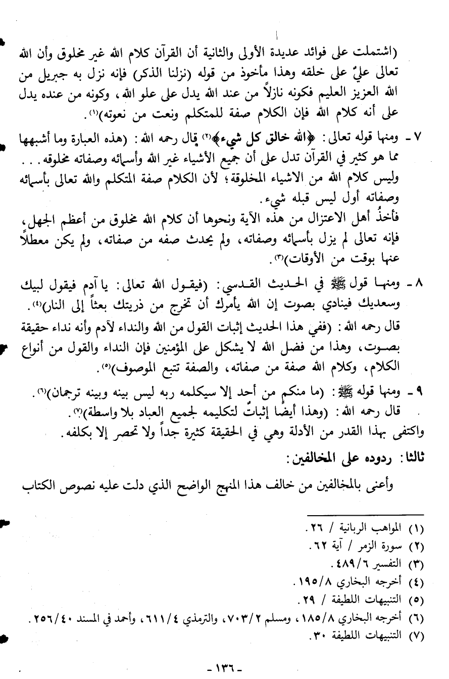 7ـ ومنها قوله تعالى: {اللَّهُ خَالِقُ كُلِّ شَيْءٍ} 2 قال رحمه الله: "هذه العبارة وما أشبهها مما هو كثير في القرآن تدل على أن جميع الأشياء غير الله وأسمائه وصفاته مخلوقة ... وليس كلام الله من الأشياء المخلوقة؛ لأن الكلام صفة المتكلم والله تعالى بأسمائه وصفاته أول ليس قبله شيء.