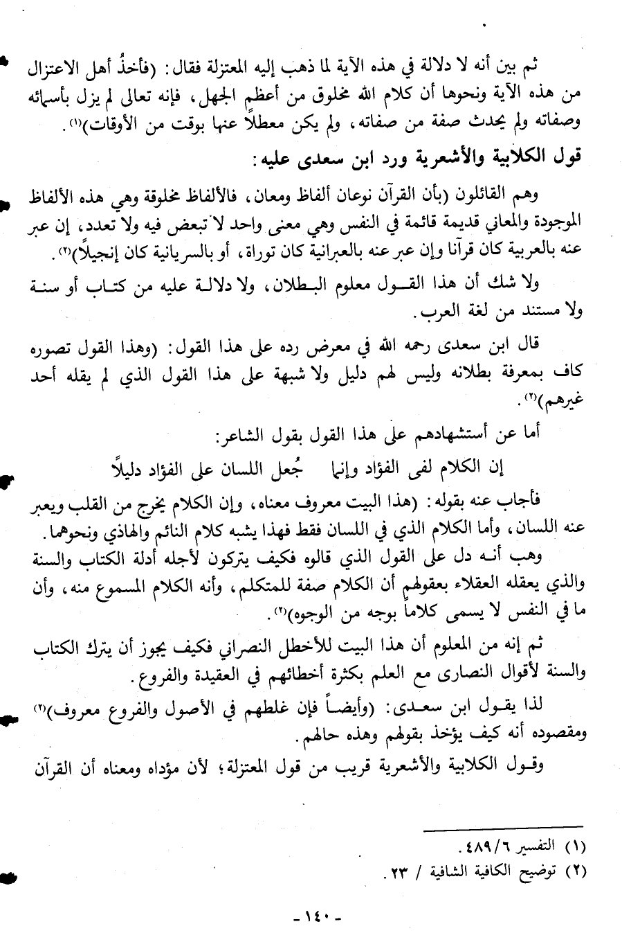 قول الكلابية والأشعرية ورد ابن سعدي عليه: