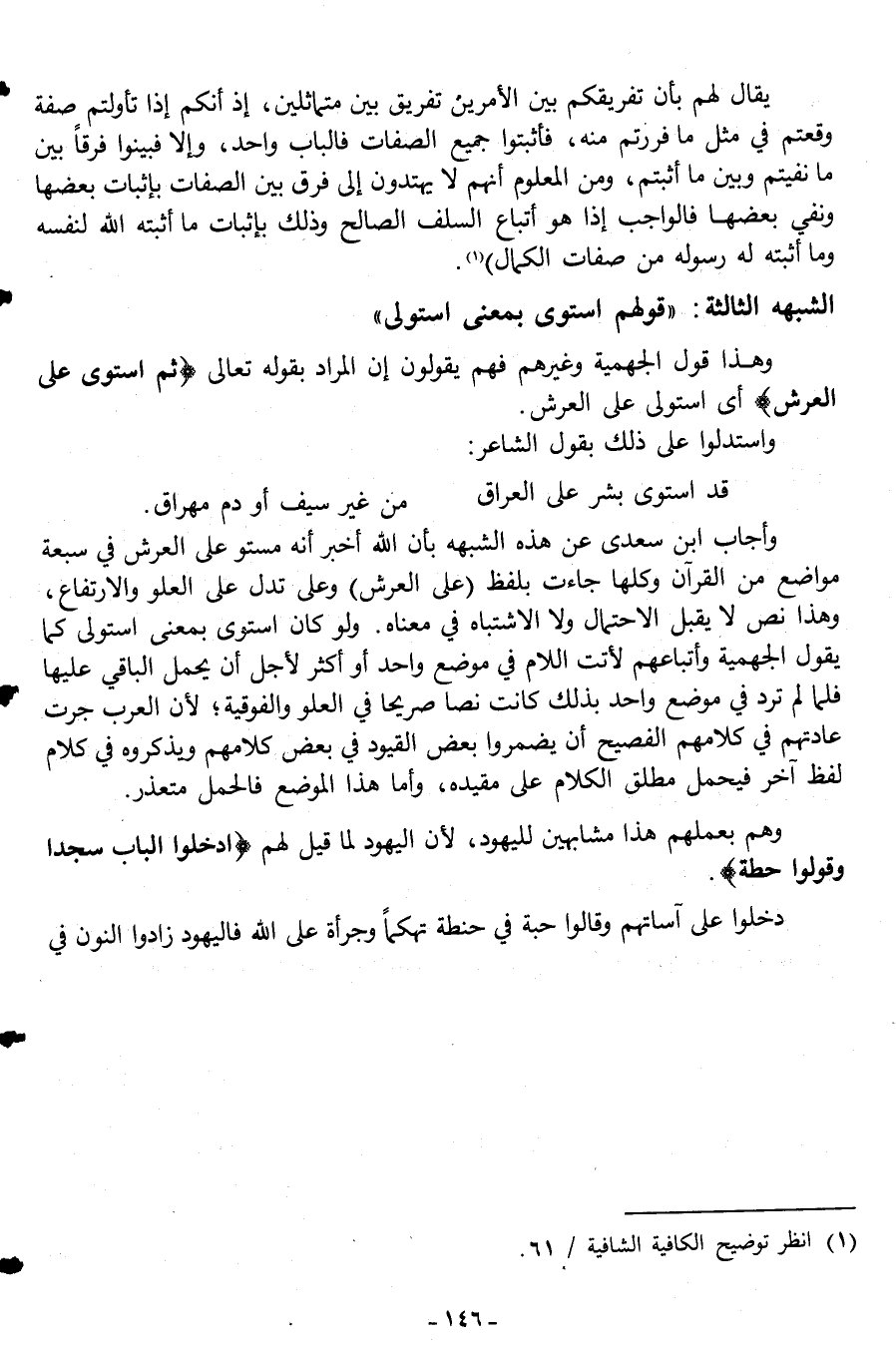يقال لهم بأن تفريقكم بين الأمرين تفريق بين متماثلين، إذ أنكم إذا تأولتم صفة وقعتم في مثل ما فررتم منه، فأثبتوا جميع الصفات فالباب واحد، وإلا فبينوا فرقاً بين ما نفيتم وبين ما أثبتم، ومن المعلوم أنهم لا يهتدون إلى فرق بين الصفات بإثبات بعضها ونفي بعضها فالواجب إذا هو اتباع السلف الصالح وذلك بإثبات ما أثبته الله لنفسه وما أثبته له رسوله من صفات الكمال"1.