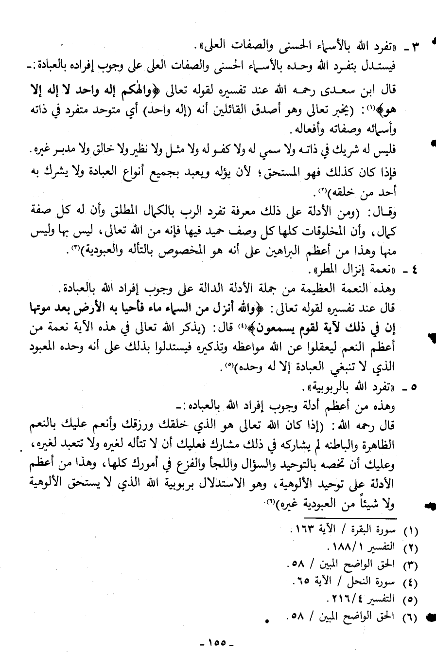 فيستدل بتفرد الله وحده بالأسماء الحسنى والصفات العلى على وجوب إفراده العبادة: ـ قال ابن سعدي رحمه الله عند تفسيره لقوله تعالى {وَإِلَهُكُمْ إِلَهٌ وَاحِدٌ لا إِلَهَ إِلَّا هُوَ} 1: "يخبر تعالى وهو أصدق القائلين أنه (إله واحد) أي متوحد متفرد في ذاته وأسمائه وصفاته وأفعاله.
