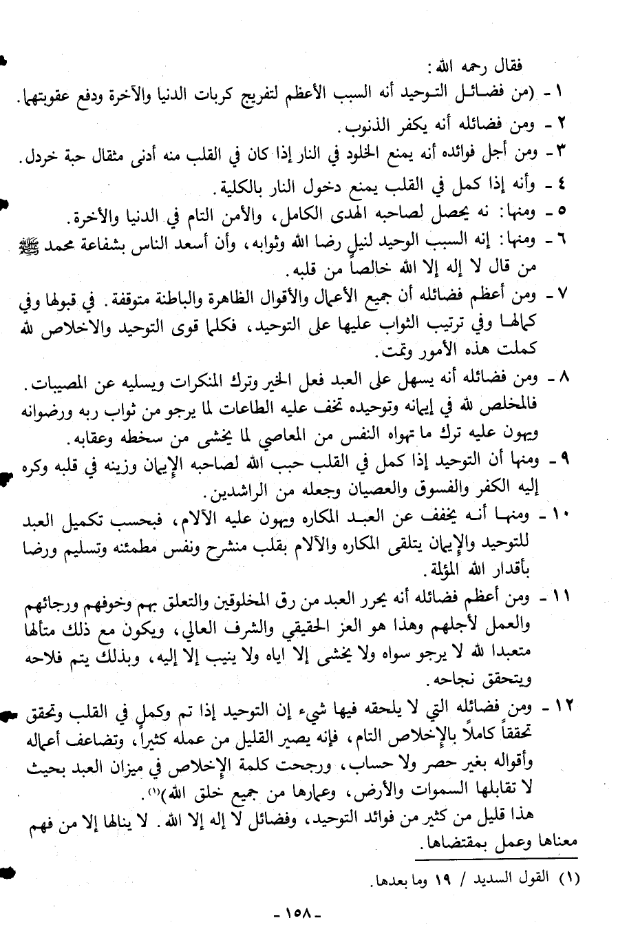 1ـ "من فضائل التوحيد أنه السبب الأعظم لتفريج كربات الدنيا والآخرة ودفع عقوبتهما.