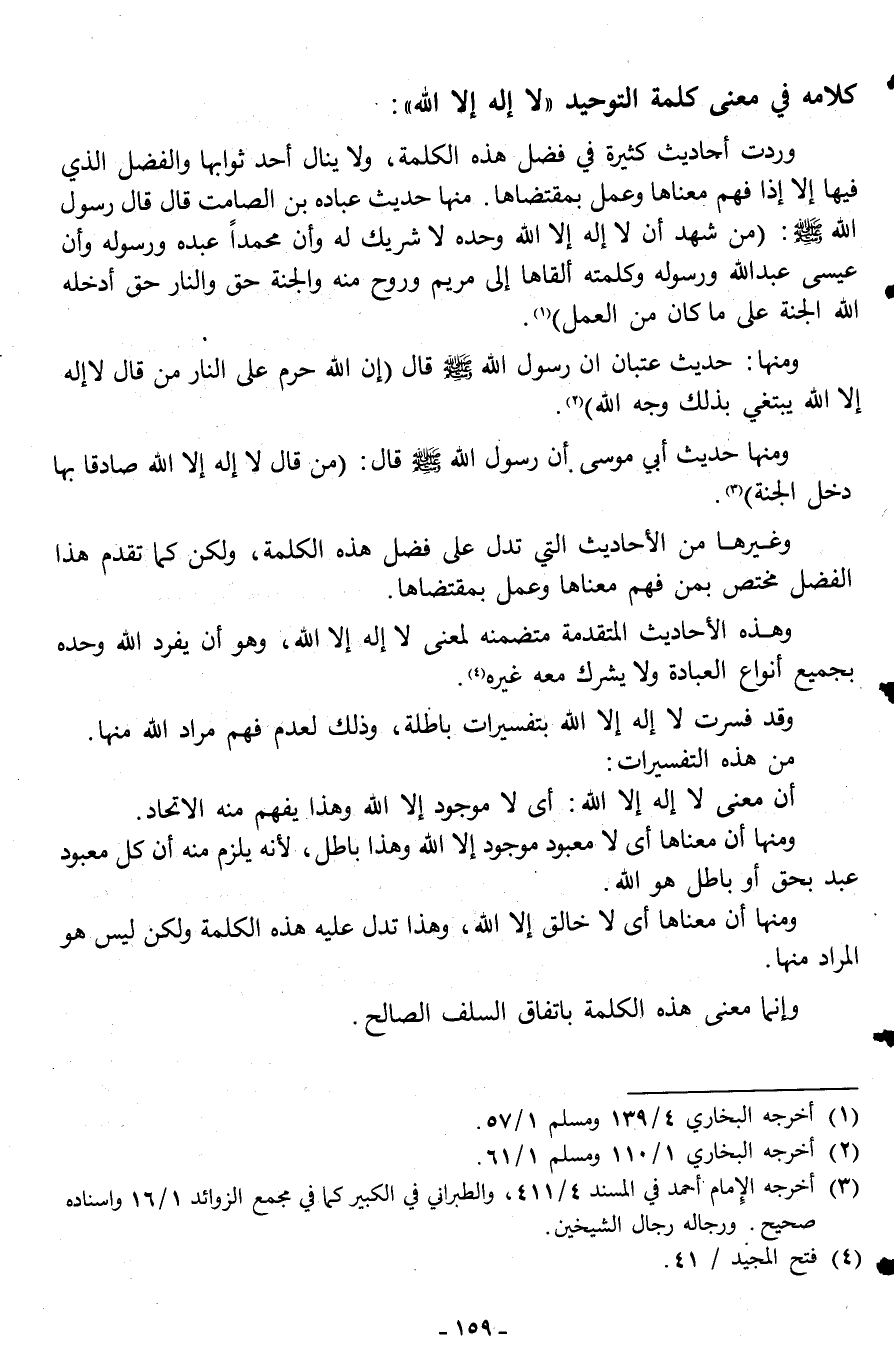 وهذه الأحاديث المتقدمة متضمنة لمعنى لا إله إلا الله، وهو أن يفرد الله وحده بجميع أنواع العبادة ولا يشرك معه غيره4.