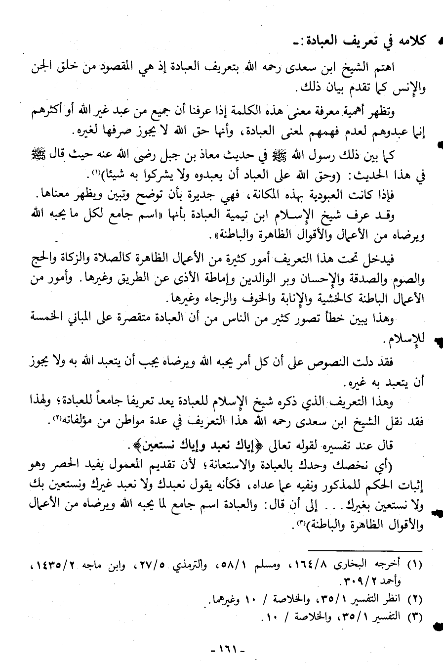 وهذا التعريف الذي ذكره شيخ الإسلام للعبادة يعد تعريفا جامعاً للعبادة؛ ولهذا فقد نقل الشيخ ابن سعدي رحمه الله هذا التعريف في عدة مواطن من مؤلفاته2.