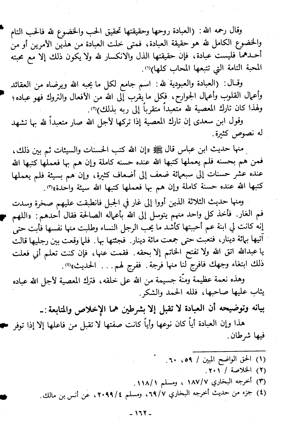 بيان وتوضيحه أن العبادة لا تقبل إلا بشرطين هما الإخلاص والمتابعة:-