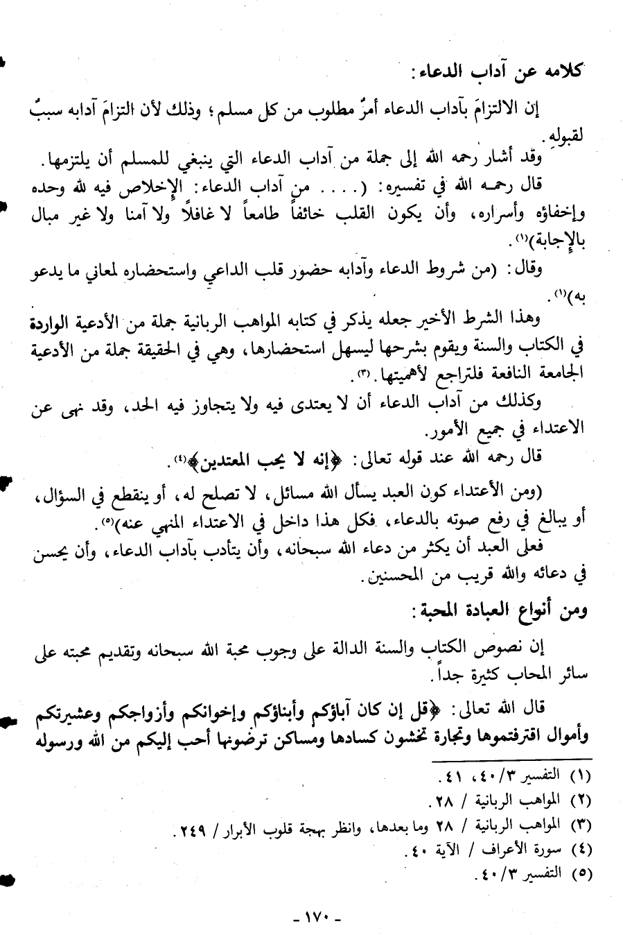 وهذا الشرط الأخير جعله يذكر في كتابه المواهب الربانية جملة من الأدعية الواردة في الكتاب والسنة ويقوم بشرحها ليسهل استحضارها، وهي في الحقيقة جملة من الأدعية الجامعة النافعة فلتراجع لأهميتها3.