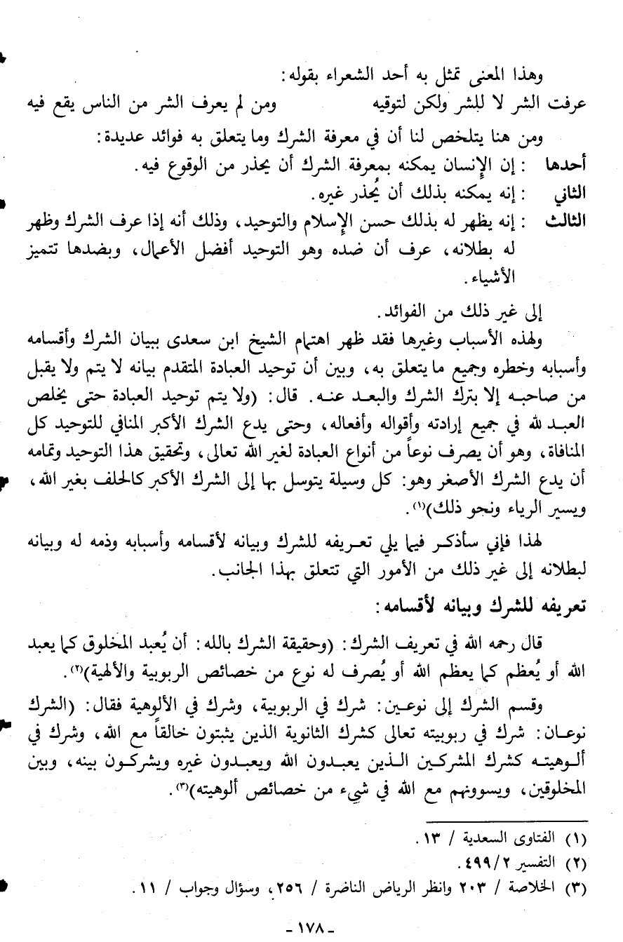 ولهذا فإني سأذكر فيما يلي تعريفه للشرك وبيانه لأقسامه وأسبابه وذمه له وبيانه لبطلانه إلى غير ذلك من الأمور التي تتعلق بهذا الجانب.