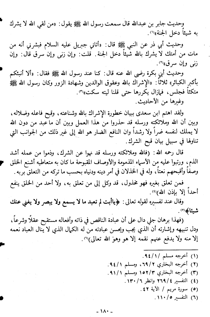 "فهذا برهان جلي دال على أن عبادة الناقص في ذاته وأفعاله مستقبح عقلاً وشرعاً، ودل تنبيهه وإشارته أن الذي يجب ويحسن عبادته من له الكمال الذي لا ينال العباد نعمة إلا منه ولا يدفع عنهم نقمة إلا هو الله تعالى"6.