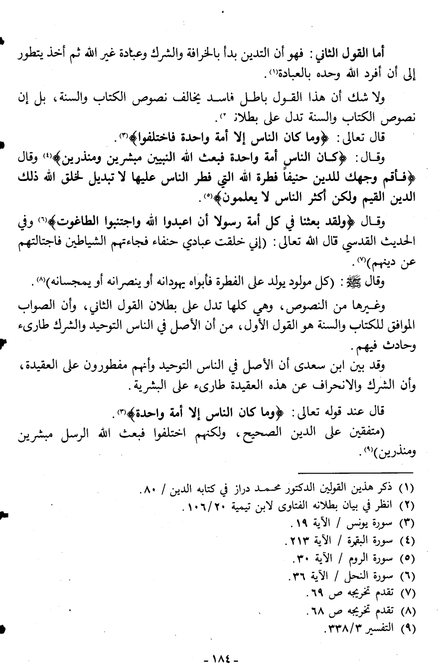 وغيرها من النصوص، وهي كلها تدل على بطلان القول الثاني، وأن الصواب الموافق للكتاب والسنة وهو القول الأول، من أن الأصل في الناس التوحيد والشرك طارئ وحادث فيهم.