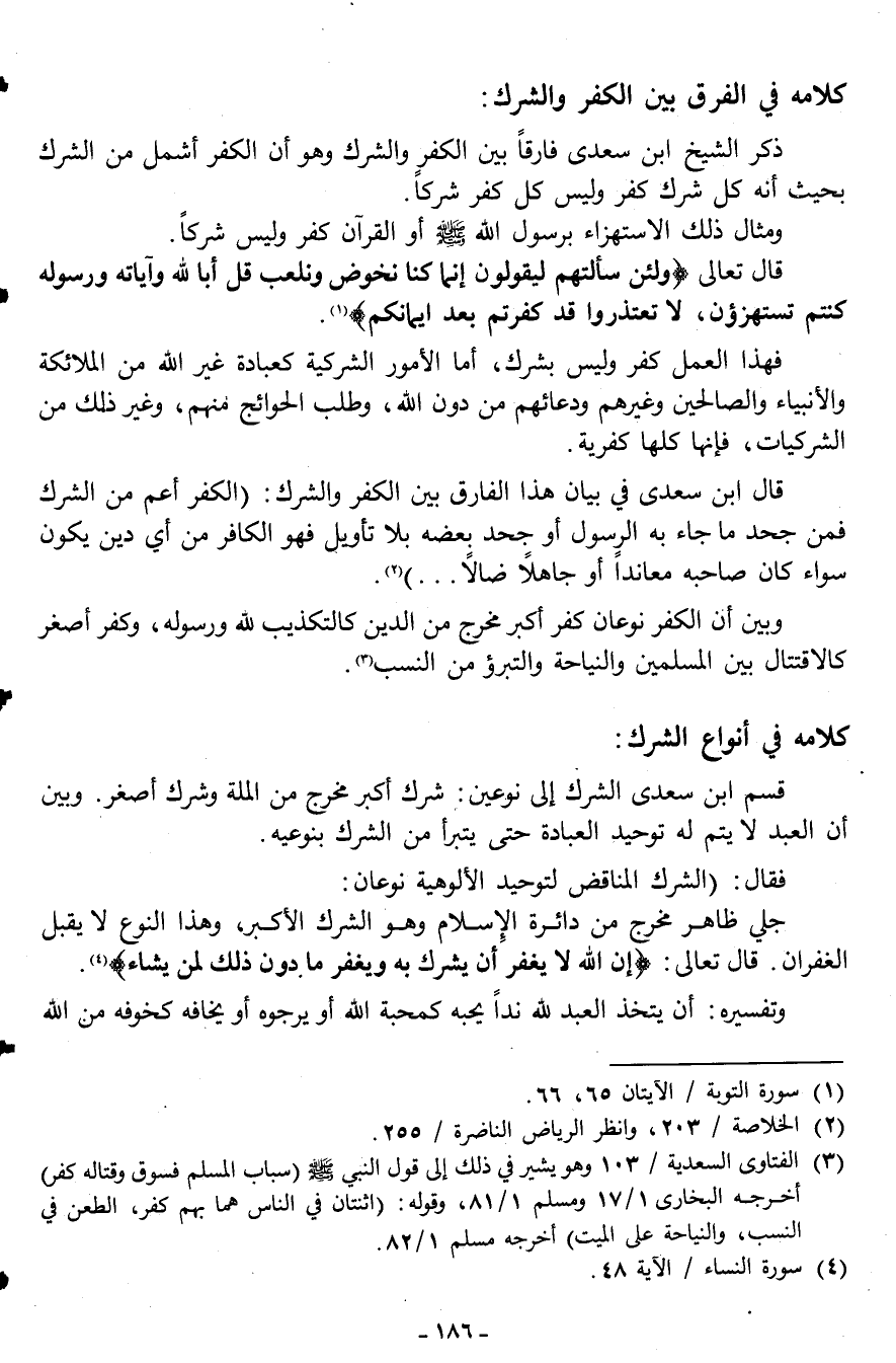3 الفتاوى السعدية /103، وهو يشير في ذلك إلى قول النبي صلى الله عليه وسلم: "سباب المسلم فسسوق وقتاله كفر" أخرجه البخاري 1/17، ومسلم 1/81، وقوله: "اثنتان في الناس هما بهم كفر، الطعن في النسب، والنياحة على الميت" أخرجه مسلم 1/82.