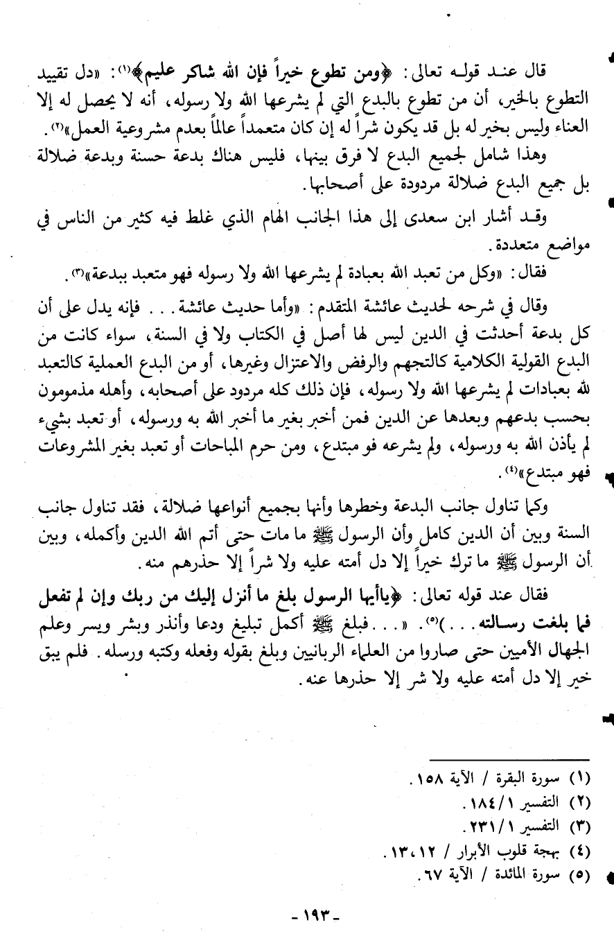 قال عند قوله تعالى: {وَمَنْ تَطَوَّعَ خَيْراً فَإِنَّ اللَّهَ شَاكِرٌ عَلِيمٌ} 1: "دل تقييد التطوع بالخير، أن من تطوع بالبدع التي لم يشرعها الله ولا رسوله، أنه لا يحصل له إلا العناء وليس بخير له بل قد يكون شراً له إن كان متعمداً عالماً بعدم مشروعية العمل"2.