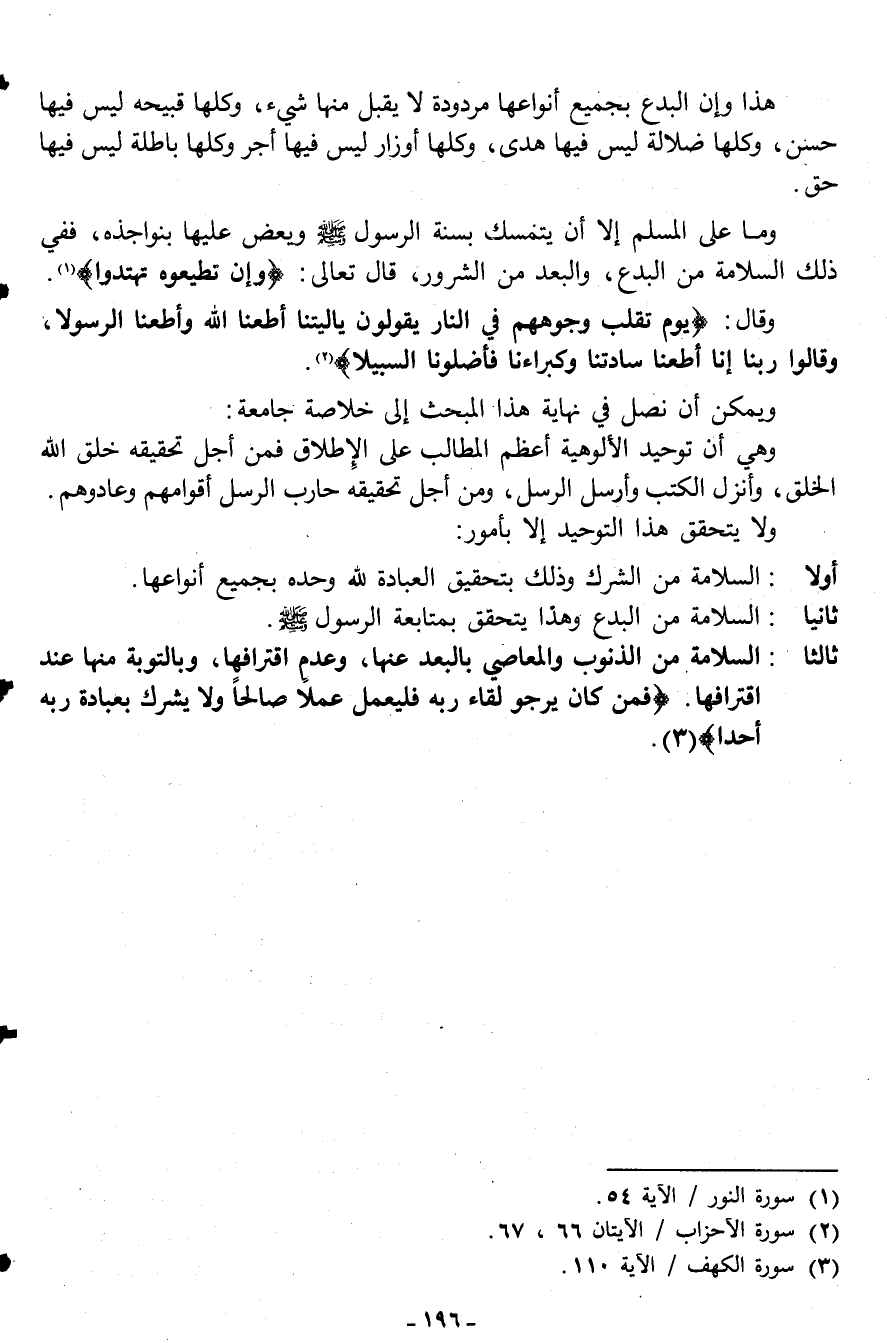 ثالثا: السلامة من الذنوب والمعاصي بالبعد عنها، وعدم اقترافها، وبالتوبة منها عند اقترافها. {فَمَنْ كَانَ يَرْجُوا لِقَاءَ رَبِّهِ فَلْيَعْمَلْ عَمَلاً صَالِحاً وَلا يُشْرِكْ بِعِبَادَةِ رَبِّهِ أَحَداً} 3.