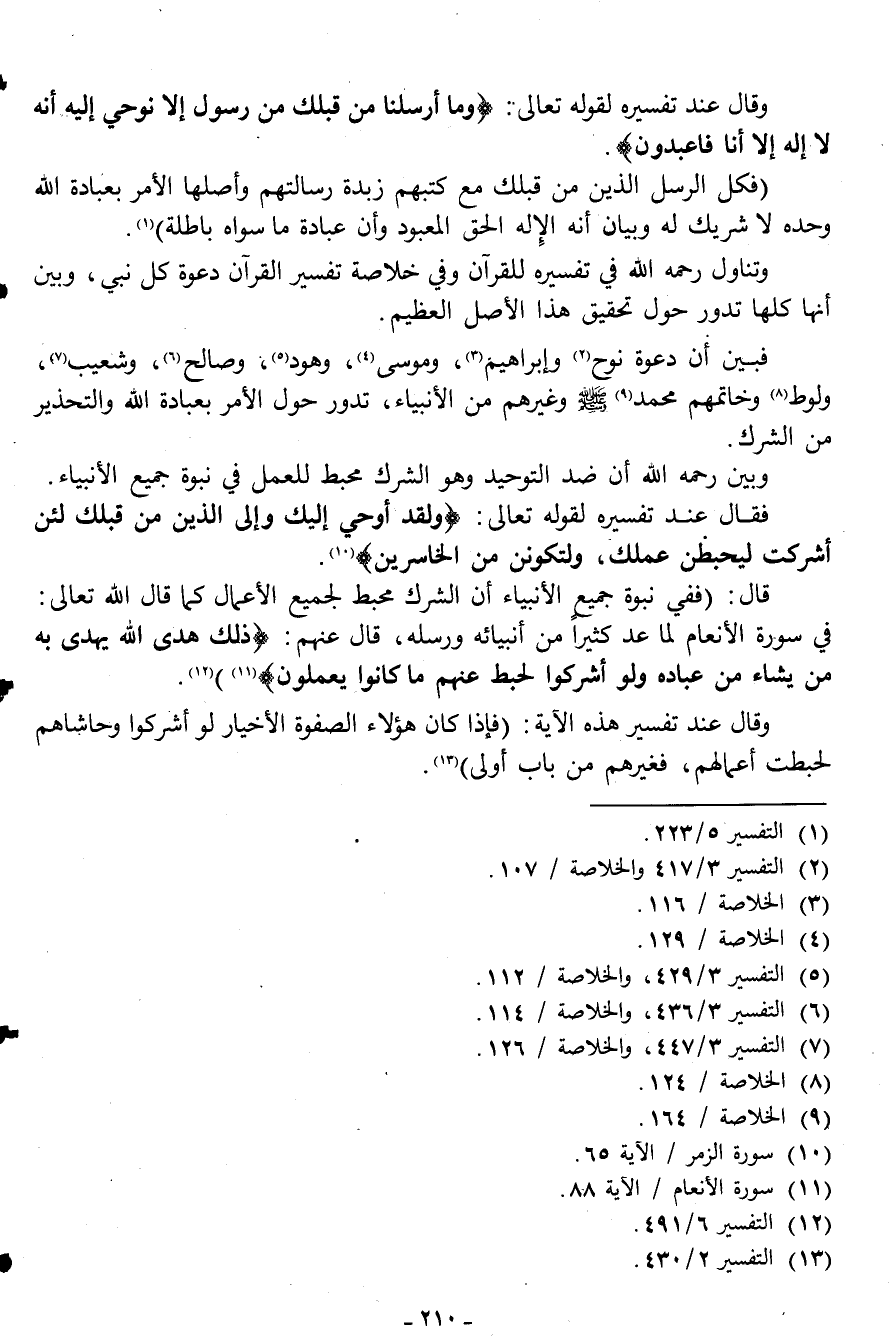 وقال عند تفسيره لقوله تعالى: {وَمَا أَرْسَلْنَا مِنْ قَبْلِكَ مِنْ رَسُولٍ إِلَّا نُوحِي إِلَيْهِ أَنَّهُ لا إِلَهَ إِلَّا أَنَا فَاعْبُدُونِ} .