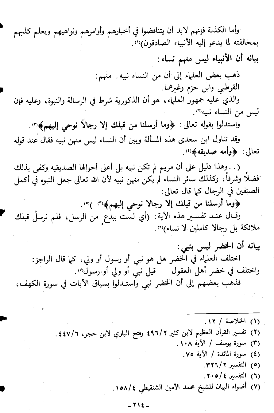 "....وهذا دليل على أن مريم لم تكن نبية بل أعلى أحوالها الصديقية وكفى بذلك فضلاً وشرفاً، وكذلك سائر النساء لم يكن منهن نبيه لأن الله تعالى جعل النبوة في أكمل الصنفين في الرجال كما قال تعالى: