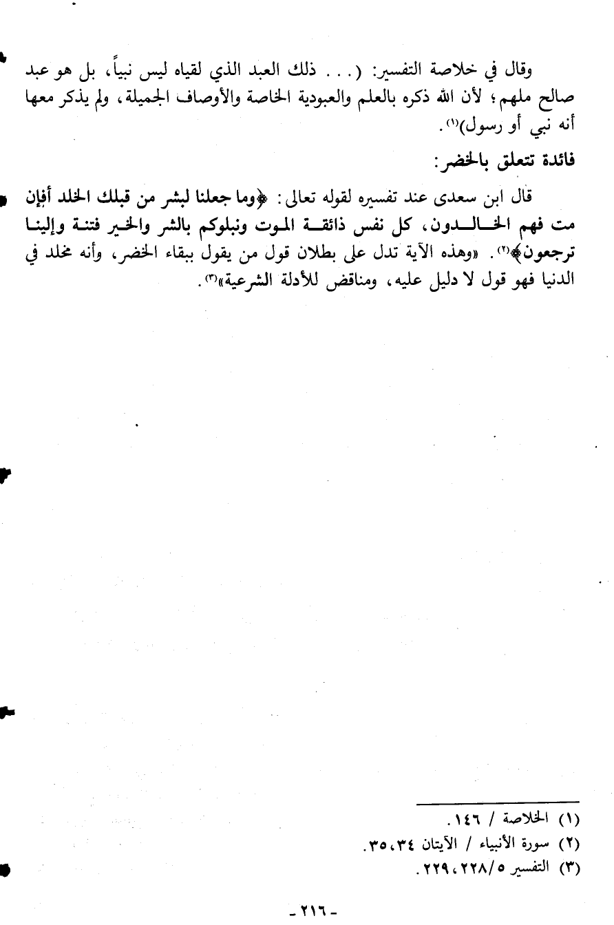 قال ابن سعدي عند تفسيره لقوله تعالى: {وَمَا جَعَلْنَا لِبَشَرٍ مِنْ قَبْلِكَ الْخُلْدَ أَفَإِنْ مِتَّ فَهُمُ الْخَالِدُونَ. كُلُّ نَفْسٍ ذَائِقَةُ الْمَوْتِ وَنَبْلُوكُمْ بِالشَّرِّ وَالْخَيْرِ فِتْنَةً وَإِلَيْنَا تُرْجَعُونَ} 2. "وهذه الآية تدل على بطلان قول من يقول ببقاء الخضر، وأنه مخلد في الدنيا فهو قول لا دليل عليه، ومناقض للأدلة الشرعية"3