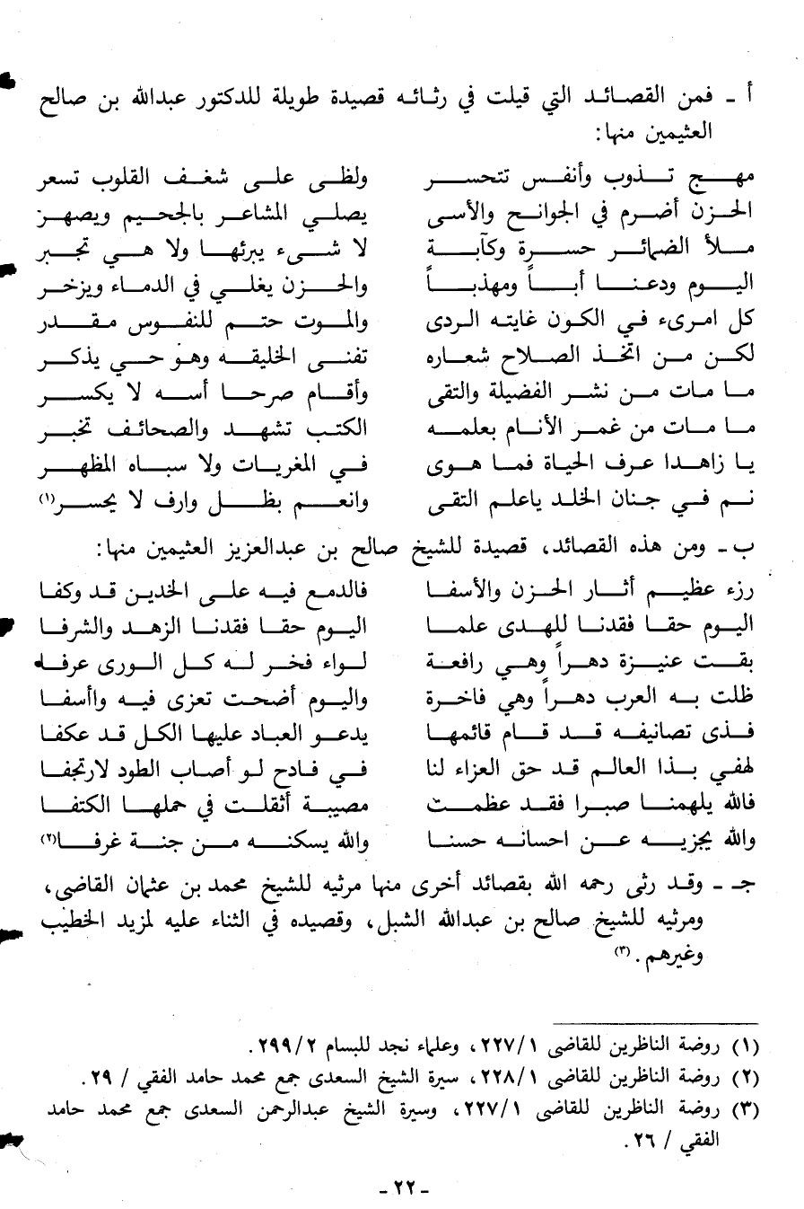 جـ ـ وقد رثى رحمه الله بقصائد أخرى منها مرثية للشيخ محمد بن عثمان القاضي، ومرثية للشيخ صالح بن عبد الشبل، وقصيدة في الثناء عليه لمزيد الخطيب وغيرهم3