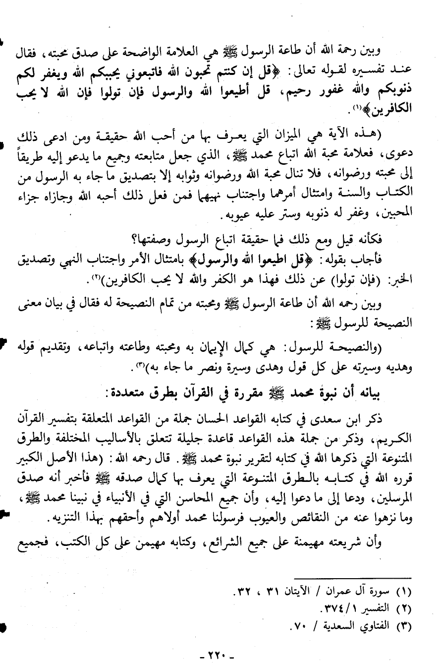 وبين رحمه الله أن طاعة الرسول صلى الله عليه وسلم هي العلامة الواضحة على صدق محبته، فقال عند تفسيره لقوله تعالى: {قُلْ إِنْ كُنْتُمْ تُحِبُّونَ اللَّهَ فَاتَّبِعُونِي يُحْبِبْكُمُ اللَّهُ وَيَغْفِرْ لَكُمْ ذُنُوبَكُمْ وَاللَّهُ غَفُورٌ رَحِيمٌ. قُلْ أَطِيعُوا اللَّهَ وَالرَّسُولَ فَإِنْ تَوَلَّوْا فَإِنَّ اللَّهَ لا يُحِبُّ الْكَافِرِينَ} 1.