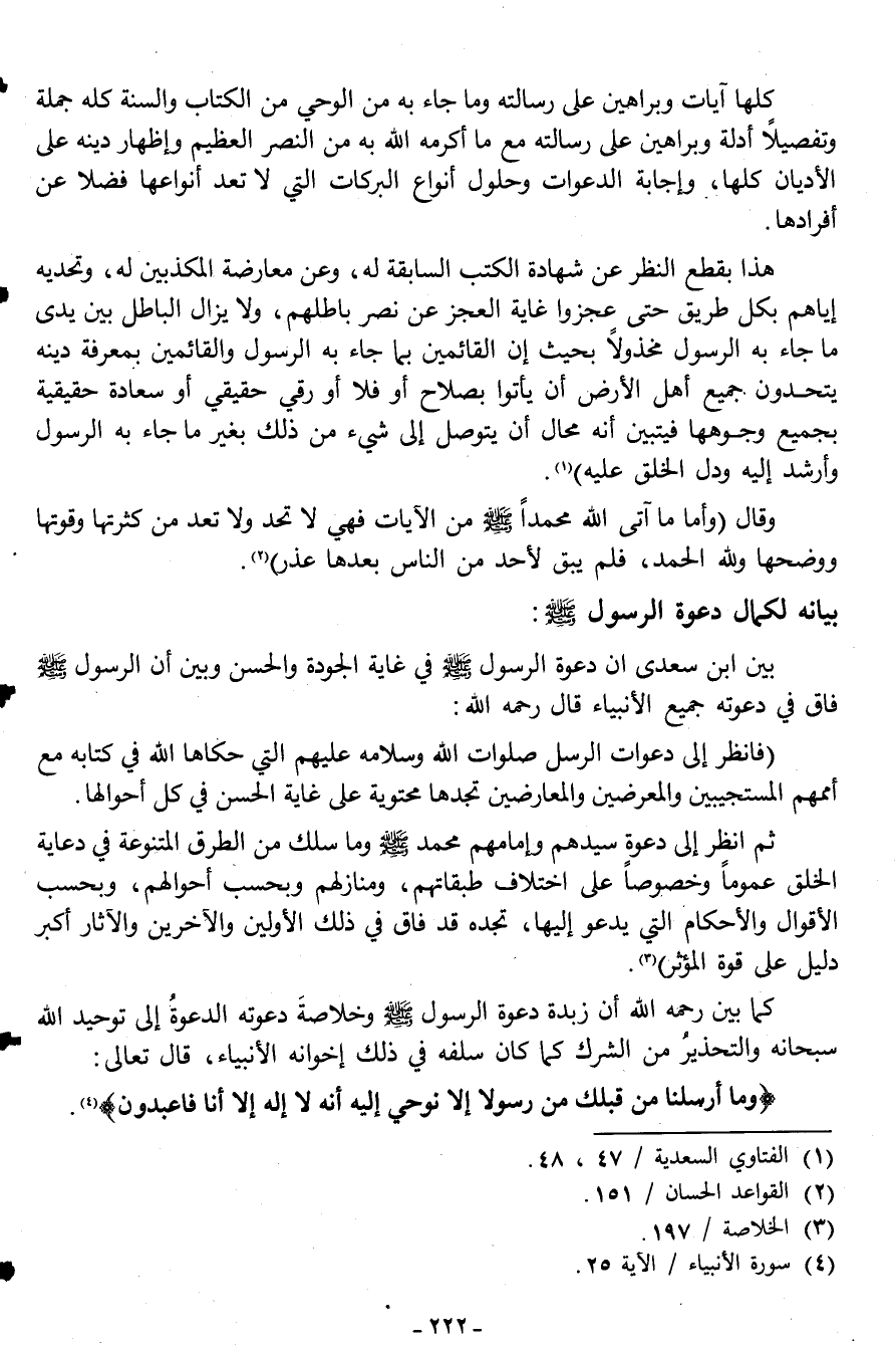 كما بين رحمه الله أن زبدة دعوة الرسول صلى الله عليه وسلم وخلاصة دعوته الدعوة إلى توحيد الله سبحانه والتحذير من الشرك كما كان سلفه في ذلك إخوانه الأنبياء، قال تعالى: