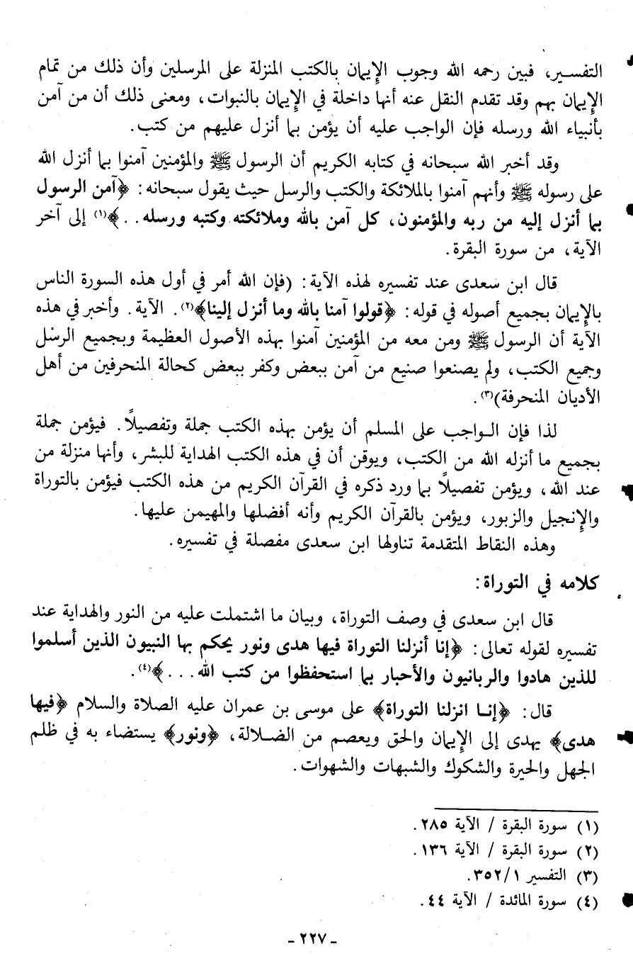 قال ابن سعدي في وصف التوراة، وبيان ما اشتملت عليه من النور والهداية عند تفسيره لقوله تعالى: {إِنَّا أَنْزَلْنَا التَّوْرَاةَ فِيهَا هُدىً وَنُورٌ يَحْكُمُ بِهَا النَّبِيُّونَ الَّذِينَ أَسْلَمُوا لِلَّذِينَ هَادُوا وَالرَّبَّانِيُّونَ وَالْأَحْبَارُ بِمَا اسْتُحْفِظُوا مِنْ كِتَابِ اللَّه....} 4.