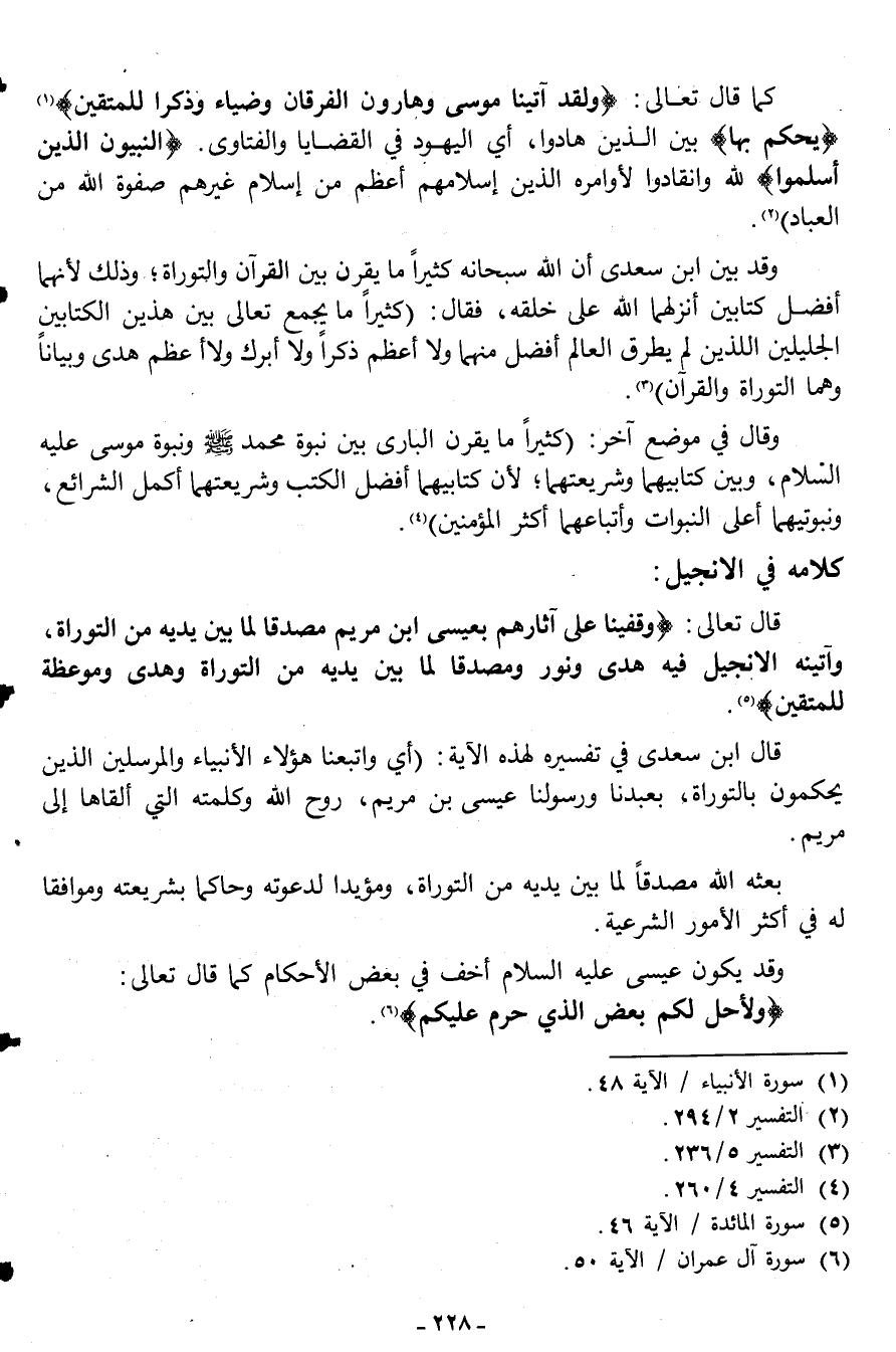 وقد بين ابن سعدي أن الله سبحانه كثيراً ما يقرن بين القرآن والتوراة؛ وذلك لأنهما أفضل كتابين أنزلهما الله على خلقه، فقال: "كثيراً ما يجمع تعالى بين هذين الكتابين الجليلين اللذين لم يطرق العالم أفضل منهما ولا أعظم ذكراً ولا أبرك ولا أعظم هدى وبياناً وهما التوراة والقرآن"3.