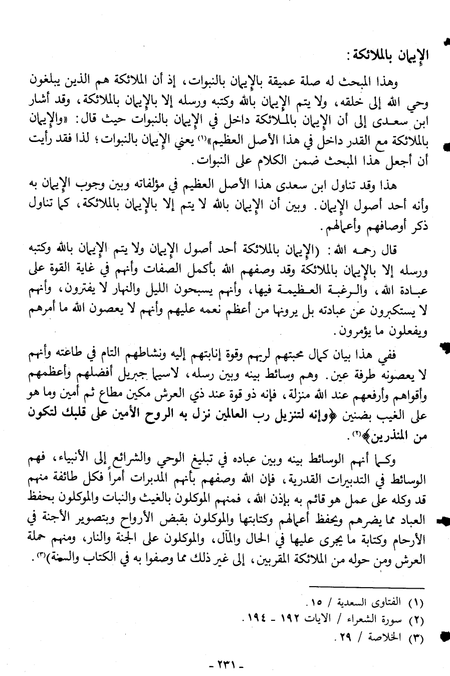 قال رحمه الله: "الإيمان بالملائكة أحد أصول الإيمان ولا يتم الإيمان بالله وكتبه ورسله إلا بالإيمان بالملائكة وقد وصفهم الله بأكمل الصفات وأنهم في غاية القوة على عبادة الله، والرغبة العظيمة فيها، وأنهم يسبحون الليل والنهار لا يفترون، وأنهم لا يستكبرون عن عبادته بل يرونها من أعظم نعمه عليهم وأنهم لا يعصون الله ما أمرهم ويفعلون ما يؤمرون.
