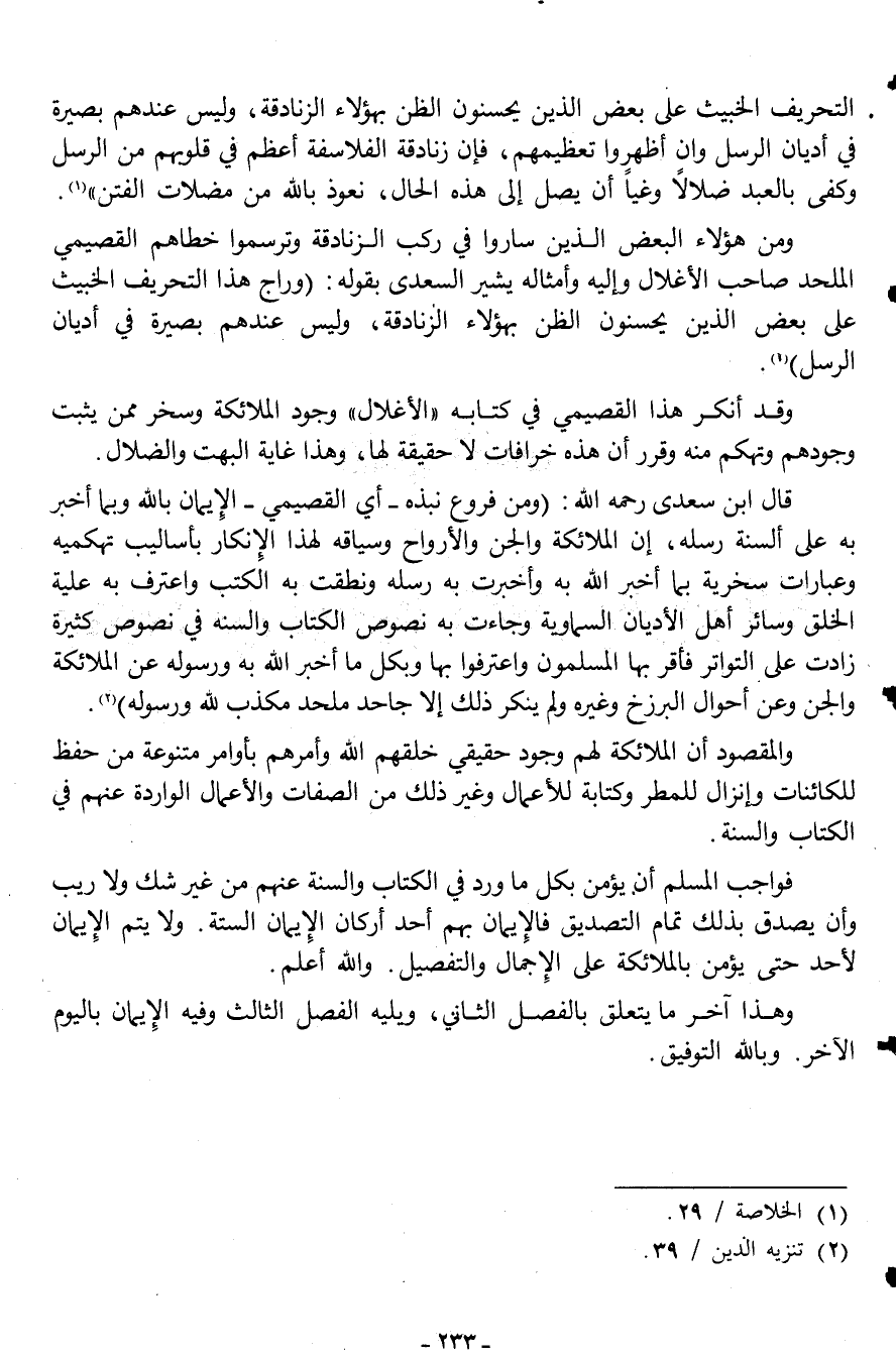 ومن هؤلاء البعض الذين ساروا في ركب الزنادقة وترسموا خطاهم القصيمي الملحد صاحب الأغلال وإليه وأمثاله يشير السعدي بقوله: "وراج هذا التحريف الخبيث على بعض الذين يحسنون الظن بهؤلاء الزنادقة، وليس عندهم بصيرة في أديان الرسل"2.