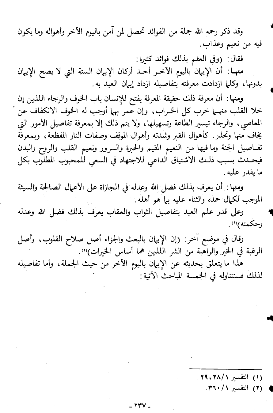 وقال في موضع آخر: "إن الإيمان بالبعث والجزاء أصل صلاح القلوب، وأصل الرغبة في الخير والرهبة من الشر اللذين هما أساس الخيرات"2.