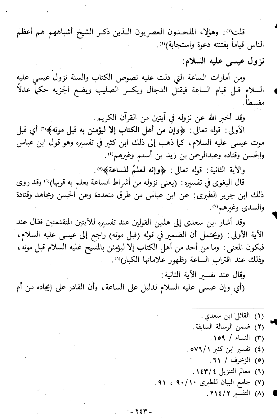 الأولى: قوله تعالى: {وَإِنْ مِنْ أَهْلِ الْكِتَابِ إِلَّا لَيُؤْمِنَنَّ بِهِ قَبْلَ مَوْتِه} 3 أي قبل موت عيسى عليه السلام، كما ذهب إلى ذلك ابن كثير في تفسيره وهو قول ابن عباس والحسن وقتادة وعبد الرحمن بن زيد بن أسلم وغيرهم4.