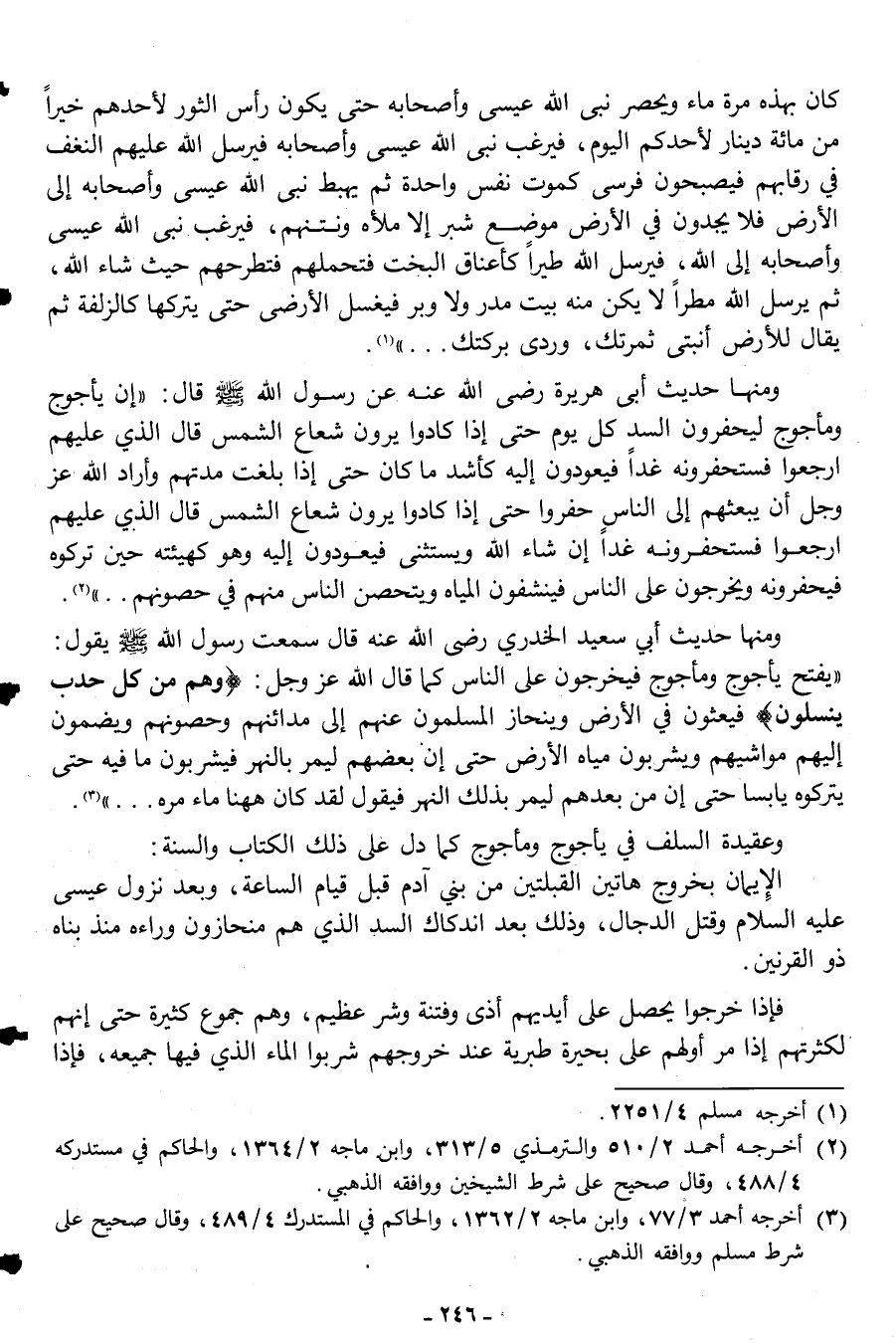 كان بهذه مرة ماء ويحصر نبي الله عيسى وأصحابه حتى يكون رأس الثور لأحدهم خيراً من مائة دينار لأحدكم اليوم، فيرغب نبي الله عيسى وأصحابه فيرسل الله عليهم النغف في رقابهم فيصبحون فرسى كموت نفس واحدة ثم يهبط نبي الله عيسى وأصحابه إلى الأرض فلا يجدون في الأرض موضع شبر إلا ملأه ونتنهم، فيرغب نبي الله عيسى وأصحابه إلى الله، فيرسل الله طيراً كأعناق البخت فتحملهم فتطرحهم حيث شاء الله، ثم يرسل الله مطراً لا يكون منه بيت مدر ولا وبر فيغسل الأرض حتى يتركها كالزلفة ثم يقال للأرض أنبتي ثمرتك، وردي بركتك...."1.