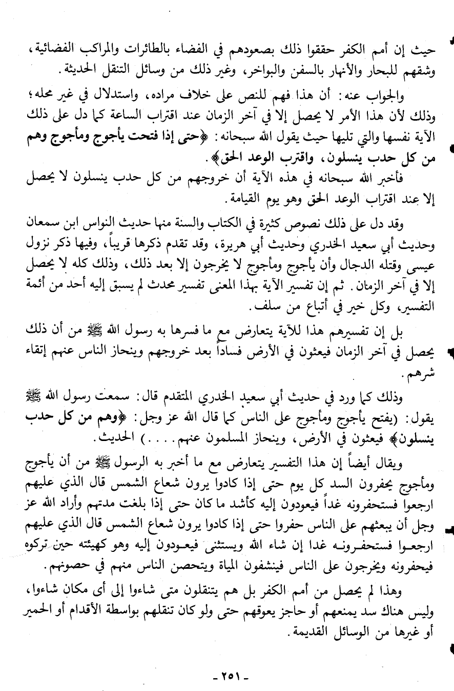 وقد دل على ذلك نصوص كثيرة في الكتاب والسنة منها حديث النواس بن سمعان وحديث أبي سعيد الخدري وحديث أبي هريرة، وقد تقدم ذكرها قريباً، وفيها ذكر نزول عيسى وقتله الدجال وأن يأجوج ومأجوج لا يخرجون إلا بعد ذلك، وذلك كله لا يحصل إلا في آخر الزمان. ثم إن تفسير الآية بهذا المعنى تفسير محدث لم يسبق إليه أحد من أئمة التفسير، وكل خير في اتباع من سلف.
