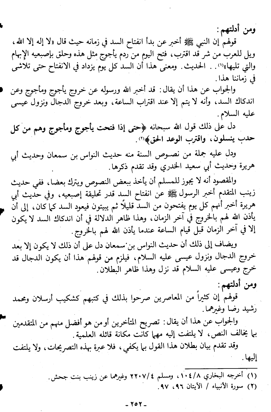 والمقصود أنه لا يجوز للمسلم أن يأخذ ببعض النصوص ويترك بعضاًَ، ففي حديث زينب المتقدم أخبر الرسول صلى الله عليه وسلم عن انفتاح السد قدر تحليقه إصبعيه، وفي حديث أبي هريرة أخبر أنهم كل يوم يفتحون من السد قليلاً ثم يبيتون فيعود السد كما كان، إلى أن يأذن الله لهم بالخروج في آخر الزمان، وهذا ظاهر الدلالة في أن اندكاك السد لا يكون إلا في آخر الزمان قبل قيام الساعة عندما يأذن الله لهم بالخروج.