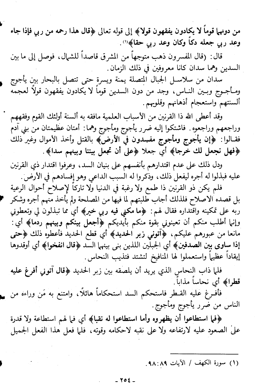 مِنْ دُونِهِمَا قَوْماً لا يَكَادُونَ يَفْقَهُونَ قَوْلاً) إلى قوله تعالى: {قَالَ هَذَا رَحْمَةٌ مِنْ رَبِّي فَإِذَا جَاءَ وَعْدُ رَبِّي جَعَلَهُ دَكَّاءَ وَكَانَ وَعْدُ رَبِّي حَقّاً} 1.