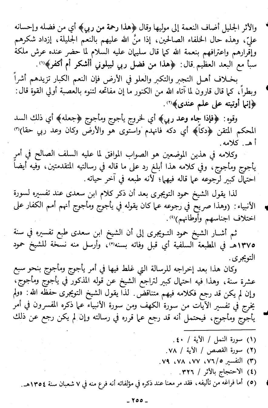 وكان هذا بعد إخراجه للرسالة التي غلط فيها في أمر يأجوج ومأجوج بنحو سبع عشرة سنة، وهذا فيه احتمال كبير لتراجع الشيخ عن قوله المذكور في يأجوج ومأجوج، وإن لم يكن قد رجع فكلامه فيهم متناقض. لذا يقول الشيخ التويجري حفظه الله: "ولم يخرج تفسير الآيات من سورة الكهف ومن سورة الأنبياء عما ذكره المفسرون في أمر يأجوج ومأجوج، فيحتمل أنه قد رجع عما قرره في رسالته وإن لم يكن رجع عن ذلك