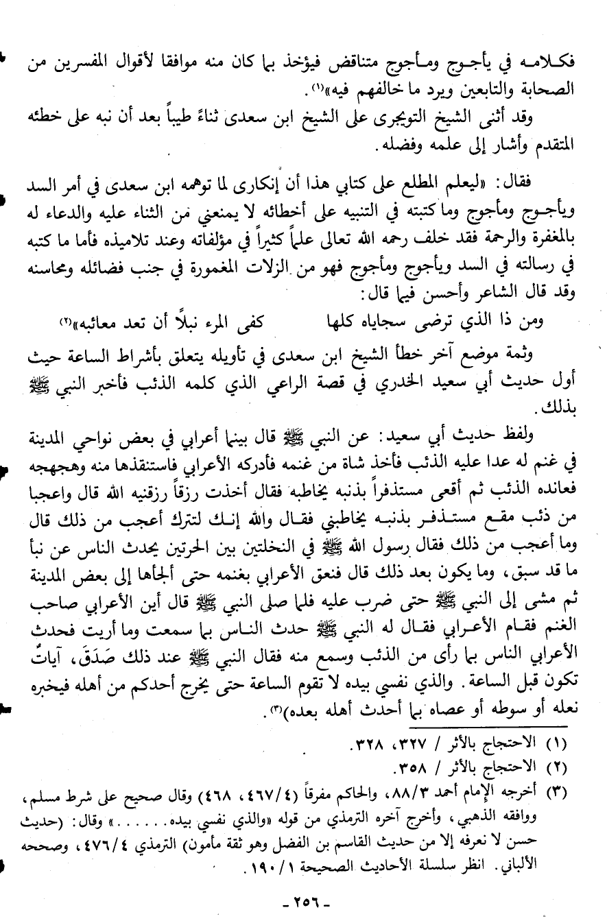 وثمة موضع آخر خطأ الشيخ ابن سعدي في تأويله يتعلق بأشراط الساعة حيث أول حديث أبي سعيد الخدري في قصة الراعي الذي كلمه الذئب فأخبر النبي صلى الله عليه وسلم بذلك.