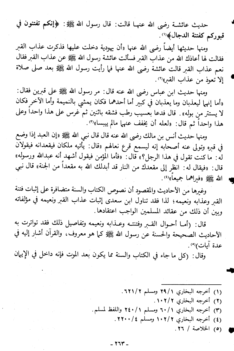 وغيرها من الأحاديث، والمقصود أن نصوص الكتاب والسنة متضافرة على إثبات فتنة القبر وعذابه ونعيمه؛ لذا فقد تناول ابن سعدي إثبات عذاب القبر ونعيمه في مؤلفاته وبين أن ذلك من عقائد المسلمين الواجب اعتقادها.