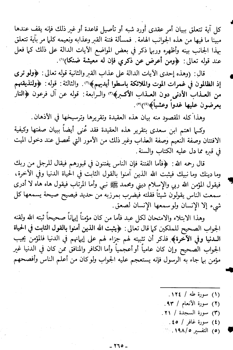 قال: "وهذه إحدى الآيات الدالة على عذاب القبر والثانية قوله تعالى: {وَلَوْ تَرَى إِذِ الظَّالِمُونَ فِي غَمَرَاتِ الْمَوْتِ وَالْمَلائِكَةُ بَاسِطُو أَيْدِيهِمْ} 2. والثالثة قوله: {وَلَنُذِيقَنَّهُمْ مِنَ الْعَذَابِ الْأَدْنَى دُونَ الْعَذَابِ الْأَكْبَرِ} 3 والرابعة: قوله عن آل فرعون {النَّارُ يُعْرَضُونَ عَلَيْهَا غُدُوّاً وَعَشِيّاً} 4.